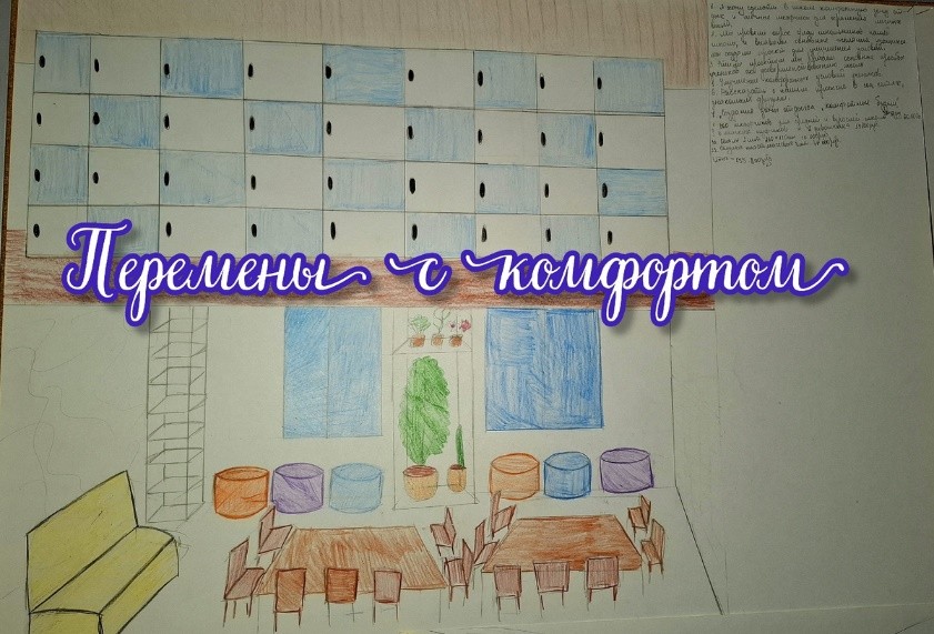 Авторы проекта «Комфортные перемены» - ученики 8-А класса, которые хотели оборудовать в школьных коридорах зоны для игр в шашки, шахматы, лото, для напольных игр-бродилок. Кроме того, они планировали установить небольшие уголки для чтения и шкафчики для хранения личных вещей.