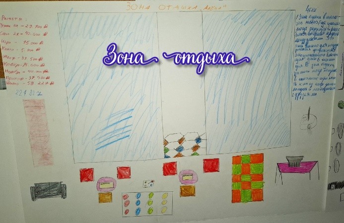 Еще один проект зоны отдыха предлагали создать ученики 8-Б класса. От предыдущего она отличается тем, что создатели планировали приобрести для нее корпусную мебель и скамейки.